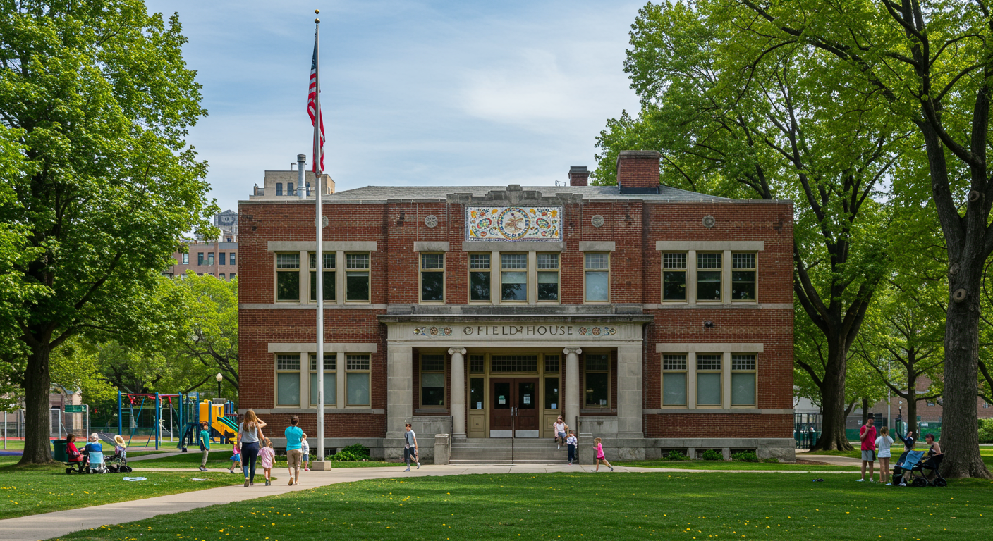 The historic fieldhouse, pictured below, features a mosaic with scenes from the work of Chicago children’s poet Eugene Field, for whom the park is named. The mosaic was created by 15 local teens in the Gallery 37 in the Parks program.