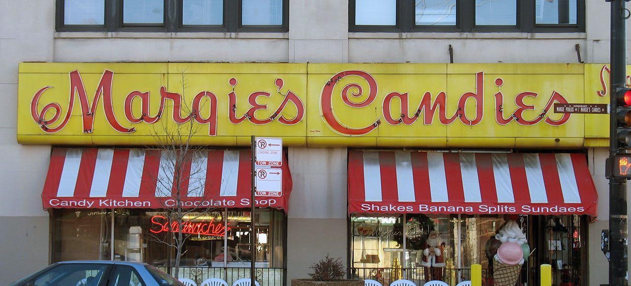 The original location of Margie’s Candies, a candy and ice cream parlor, is on Western in Bucktown. It opened under a different name in 1921, then became Margie’s in 1933. Photo cropped from the original, taken in 2007 by Marc Heiden, via Wikimedia Commons.