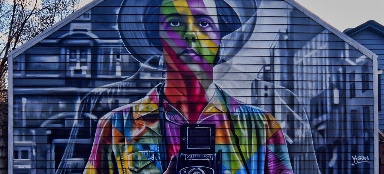 Mural titled “Tribute to Vivian Maier” by Eduardo Kobra on a house at 1651 West North Avenue at Paulina Street in Bucktown. Photo cropped from the original, taken in 2019 by Terence Faircloth [CC BY-NC-ND 2.0], via Flickr.