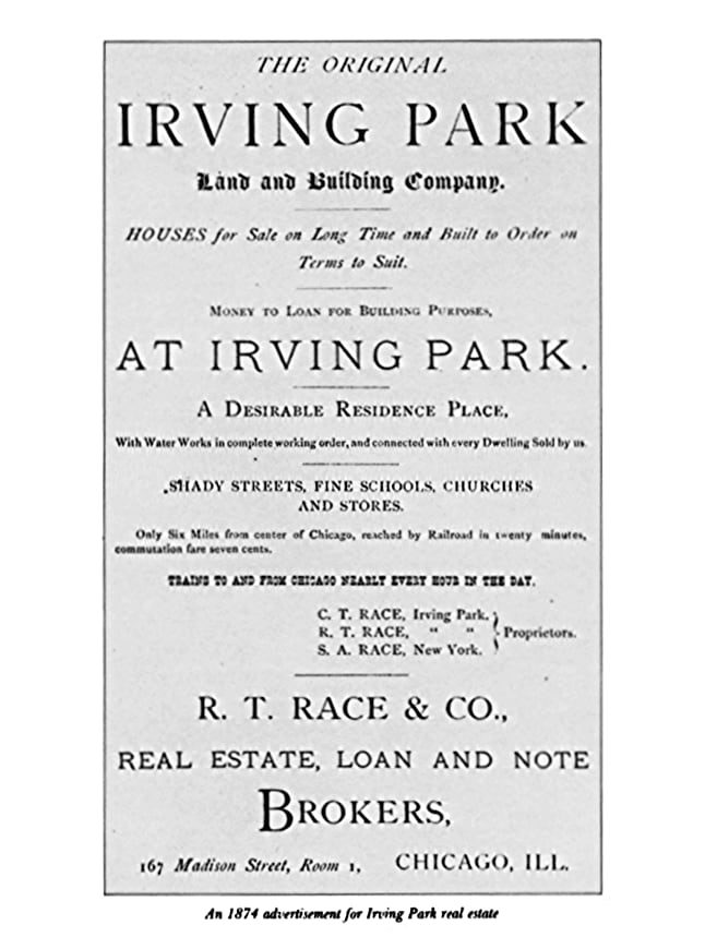 The greater Irving Park area was originally developed as Major Noble’s farm in 1843. He sold the home to four men from New York in 1869 and retired further from the city. These men continued to buy more land and eventually decided to set up a suburb. Chicago & North Western Railroad agreed to stop their trains in Irving Park if the developers built the station, and that station stands to this day. Irving Park was annexed to Chicago in 1889. The neighborhood grew up until the Depression, then experienced decades of displacement and setbacks. This lasted until the 1980s, when Old Irving Park was rediscovered and once again appreciated for the beauty of its homes and its history.