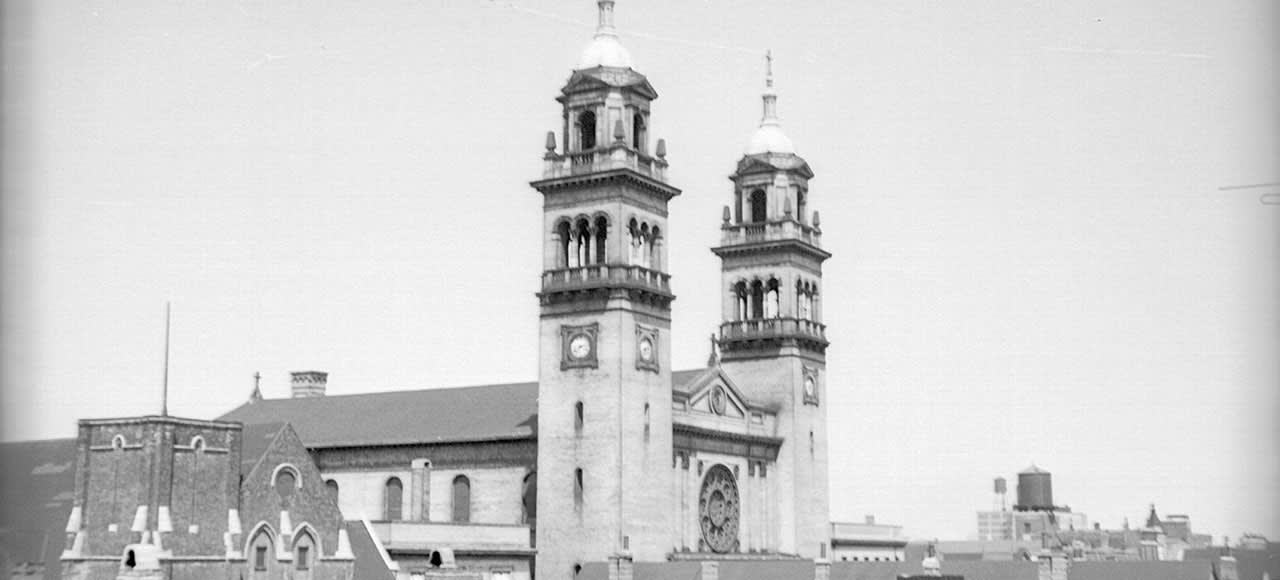 A photo of the historic Pilsen Catholic church, St. Adalbert, taken in 1951. As the tallest structure in Pilsen, its towers are an iconic part of the neighborhood. The church was built in 1914. Unfortunately, St. Adalbert’s final mass is being held this month: Repairs and necessary overhauls to the building have been deemed too costly. Photo cropped from the original by Joe+Jeanette Archie [CC BY 2.0], via Flickr.