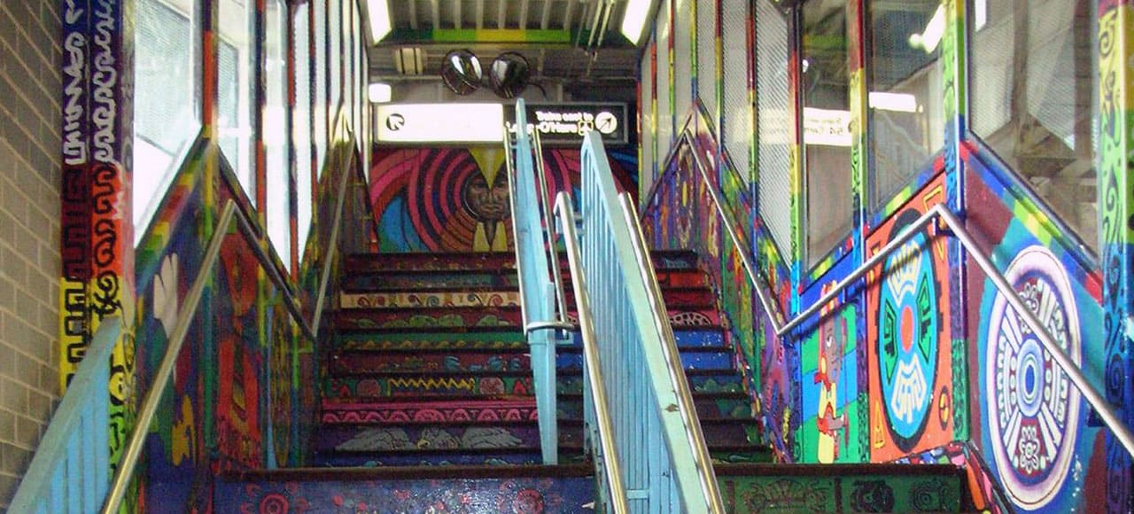 The 18th Street El Pink Line stop stairway. Photo cropped from the original, taken in 2007 by Richie Diesterheft [CC BY 2.0], via Flickr.