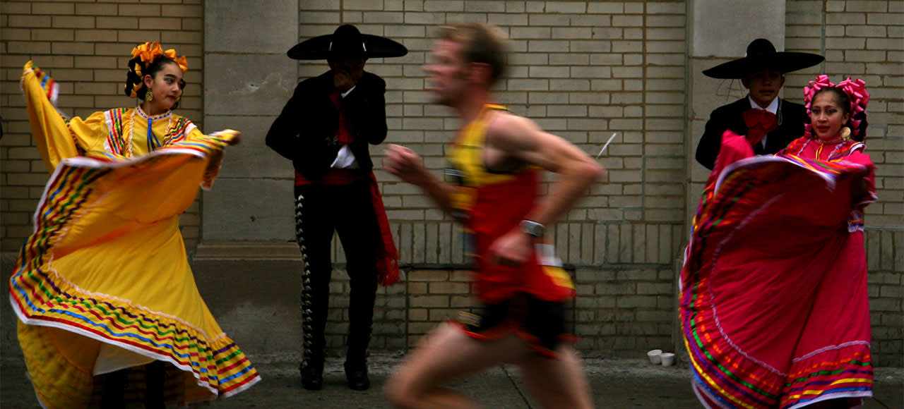Dancing during the Chicago Marathon, an annual tradition. Photo cropped from the original, taken in 2006 by Señor Codo, via Wikimedia Commons.