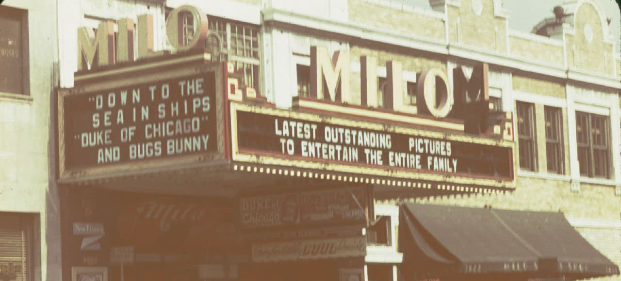A photo of the historic Milo Theater, taken in 1948. This theater was located at 1821 S. Loomis Street and was built in 1925. It was likely demolished in the 90s — a parking lot has been in this location since 2003. Photo cropped from the original by Joe+Jeanette Archie, via Wikimedia Commons.
