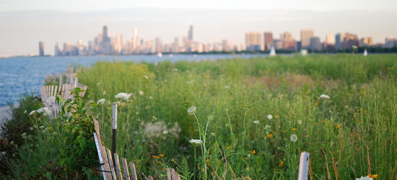 The Montrose Point Bird Sanctuary overlooking Lake Michigan and the city skyline. Photo cropped from the original, taken in 2009 by uptowner [CC BY 2.0], via Flickr.