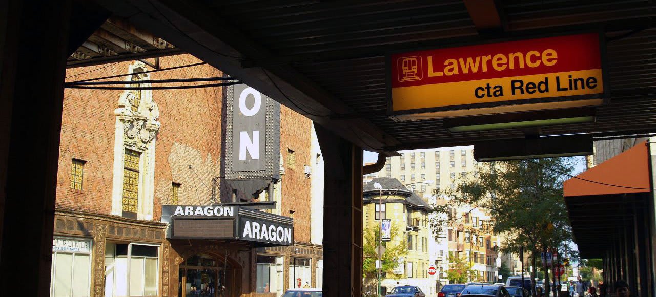 The Lawrence CTA Red Line stop in Uptown Chicago, across from the Aragon ballroom. Photo cropped from the original, taken in 2007 by Michael Lehet [CC BY-ND 2.0], via Flickr.