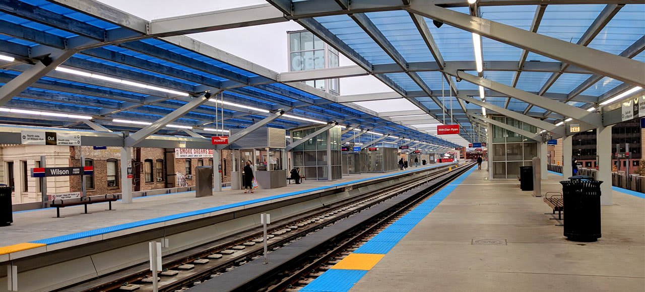The updated Wilson East Platform & Main Stationhouse in Uptown. The CTA unveiled this new platform in fall 2017. Photo cropped from the original, posted by the Chicago Transit Authority to Flickr the day after the unveiling [CC BY-NC-ND 2.0].